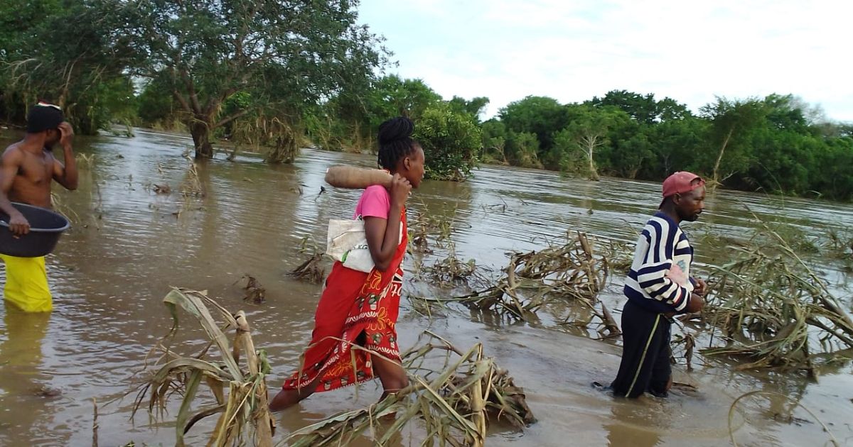 Menschen in Mosambik laufen knietief durch das Wasser eines überflutetetn Maisfeldes
