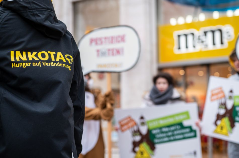 Gemeinsam mit Unterstützer*innen der Kampagne Make Chocolate Fair! machte INKOTA auf die Auswirkungen des gefährlichen Pestizideinsatzes im Kakaoanbau aufmerksam. Schokounternehmen müssen endlich Verantwortung übernehmen und Menschenrechte in ihrer Lieferkette einhalten – durch das deutsche Lieferkettengesetz sind sie auch gesetzlich dazu verpflichtet. Fast ein Jahr lang hatte Mars die Forderungen der Verbraucher*innen sowie die Gesprächsangebote seitens INKOTA ignoriert. Erst als INKOTA zum Protest vor dem M&M Store aufrief, waren Vertreter*innen von Mars zu einem persönlichen Gespräch über die gefährlichen Auswirkungen des Pestizideinsatzes in der Kakao-Lieferkette mit uns bereit.